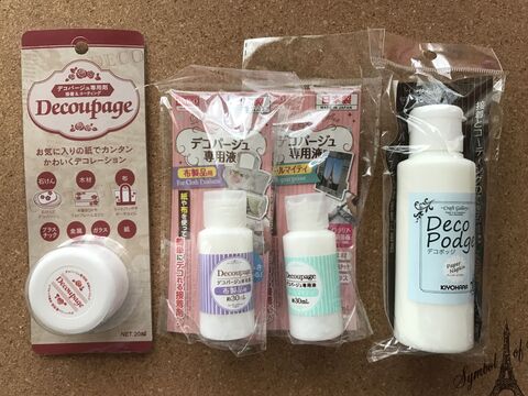 今デコパージュが人気らしいのでセリアのデコパージュ専用液を買いました ダイソーのデコパージュ専用液は、木材、プラスチック、ガラス、石けんに使う オールマイティ と、 布専用 の2種類があり、加えて、上塗り用の トップコート があります。.