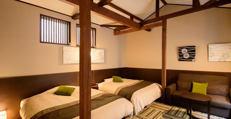 和モダンツインベッドルーム 18平米 禁煙 足湯カフェでワンドリンクの特典付 カップル 女子旅にもおすすめ 素泊まり プラン 湯畑草菴 一休 Comキラリト